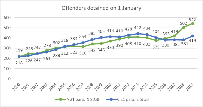 From the 1980s onwards, the number of people given custodial sentences has increased significantly. On 1 January 2000, a total of 437 people were confined under this regulation. This figure rose to 961 people on 1 January 2019. 419 of those people were confined as mentally ill but accountable offenders (§ 21 para. 2 ACC).[21] With regard to the total number of people detained within the Austrian prison system, about 10 % were confined because of a crime committed under the influence of a mental illness.[22]