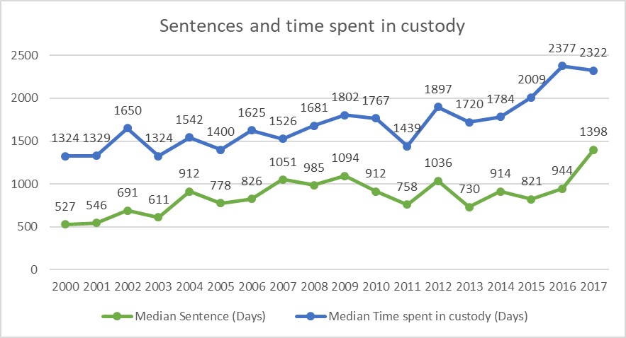 Graph 3: Development of sentences and time spent in custody after a committal applying § 21 para. 2 ACC, 2000 – 2017