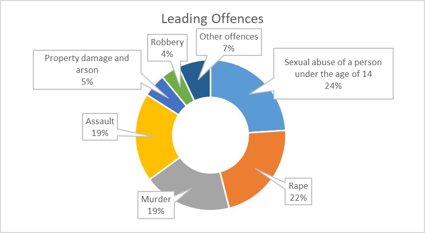 Additionally to examining the mental illnesses common among these offenders, the study explored the types of crimes committed by them, focussing on the most serious offence.[31] In 24 % of the cases, the offenders had committed sexual abuse of a person under the age of 14 (§§ 206 – 208 ACC), 22 % were guilty of offences such as rape, sexual coercion and sexual abuse of a vulnerable or mentally impaired person (§§ 201 – 205 ACC). Thus, almost 50 % of the perpetrators were committed because of an offence against sexual integrity and self-determination. Offences against life and physical integrity, such as murder or manslaughter (§§ 75, 76 ACC) or assault (§§ 125, 126 ACC) had been committed in 19 % of the cases. Offences such as property damage (§§ 125, 126 ACC) or arson (§ 169 ACC) each occurred in 5 % of the cases, 4 % were guilty of robbery (§§ 142, 143 ACC).