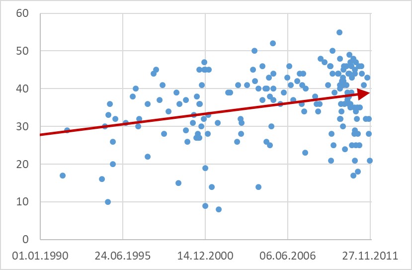 Beyond that, the expert reports are of great importance for the question of selection, since the judges rely strongly on the expert’s assessment when coming to a decision about committal or release. Thus, these expert reports were examined thoroughly as described above, evaluating every report on the basis of a list of criteria.[55] For every report a total value was calculated, adding the scores the report obtained for each criterion. While between reoffenders and non-reoffenders no difference emerged, considerable differences between the groups defined by the year of release were detected, showing that the quality of expert reports used in 2010 and 2011 was significantly higher than in the group of offenders released in 2000 and 2001. When examining the scores of each report arranged by the date of its creation (the study included reports from 1986 to 2011), a clear trend of an increase in quality over the years became apparent.